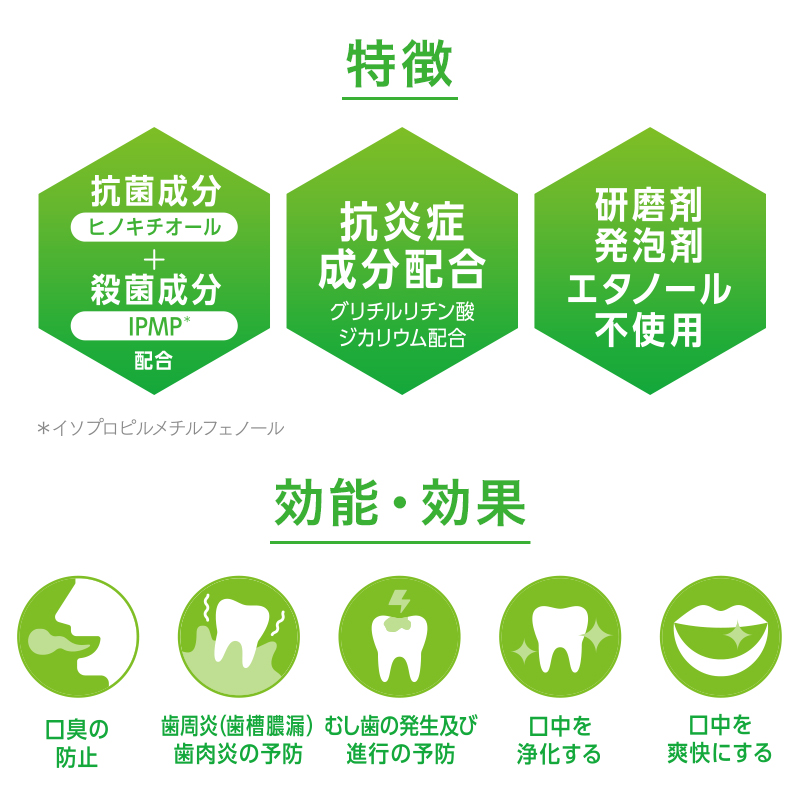 ▲抗菌成分のヒノキチオール、殺菌成分のIPMP(イソプロピルメチルフェノール)と、抗炎症成分のグリチルリチン酸ジカリウムを配合